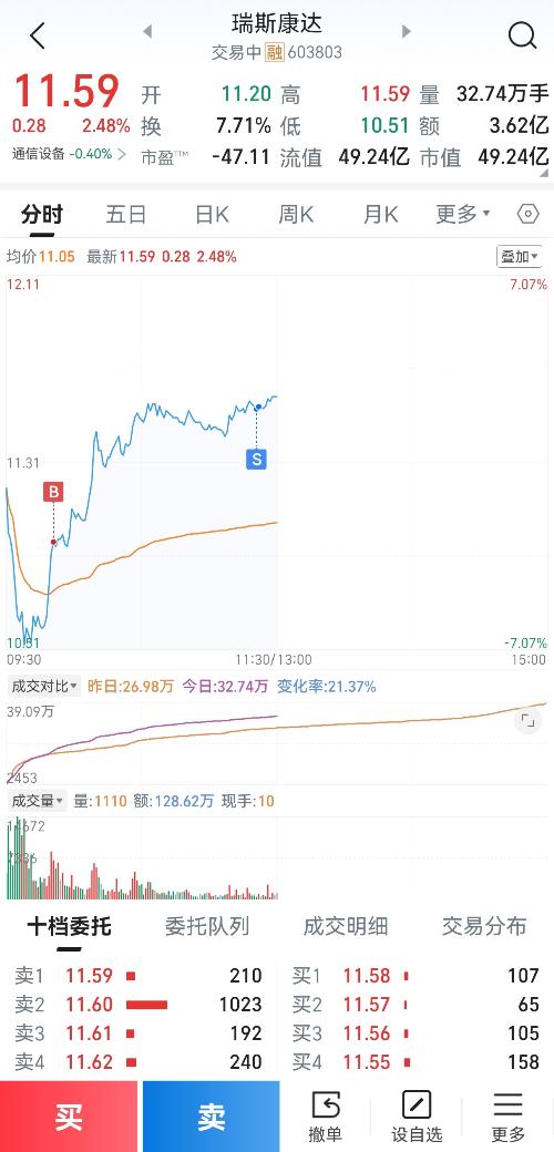 $瑞斯康达(SH603803)$$航天机电(SH600151)$ 早盘看航天机电,达康卖点没跟上,等航天封板回来再看,没买到最低点。不过做T的,做的是确定性,没吃到整条也问题不大,10.95-11.55也有5%,今日份打完收工。 航天机电继续看好走加速,明天预期一或T,分歧后缩量转一致,二波启动健康! 至于达康书记,上串下跳,只能说嘿嘿嘿....今天这个量上周就该出,可能周五没有出所以来波恐慌,总...