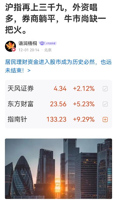 沪指再上三千九,外资唱多,券商躺平,牛市尚缺一把火。
