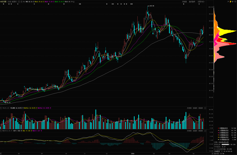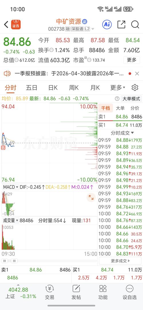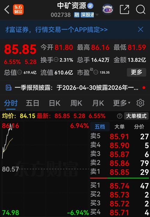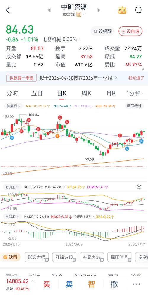 昨日中矿资源在碳酸锂期货五连涨、配额落地等多重利好共振下放量上涨6.11%,盘中最高触及86.73元。多头趋势强劲,但近3日主力资金累计净流出约3.08亿元、PE估值处于历史高位等信号不容忽视。今日大概率惯性冲高至87-89元区域后震荡整理,短期获利盘兑现压力加大,核心运行区间82.00-89.00元。可视情况做高抛低吸,若是盘中有回踩4月15日高点83.00-84.50元附近,缩量企稳时试探性低...