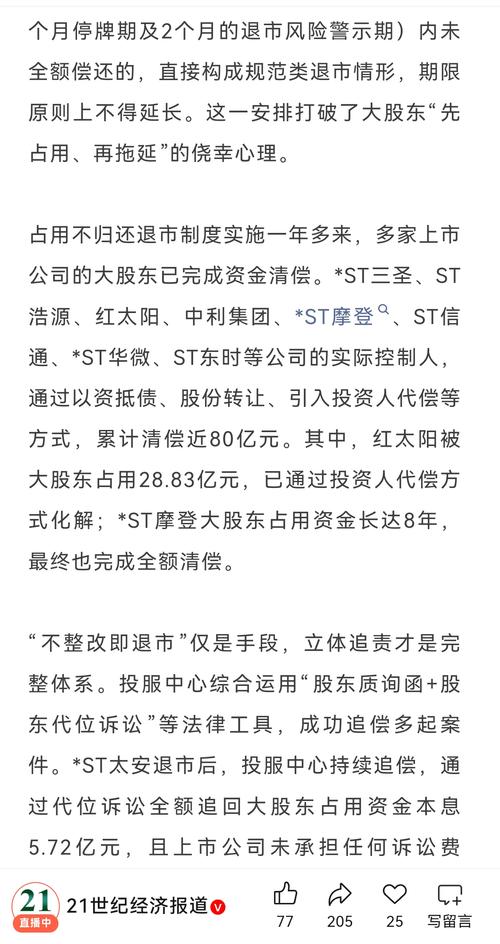 $卓然股份(SH688121)$2024年4月,证监会明确将大股东大额占用资金且不整改的情形纳入强制退市范畴。沪深交易所同步修订退市规则,规定非经营性资金占用在监管规定的整改期限(通常为6个月,整改期限过后还有2个月停牌期及2个月的退市风险警示期)内未全额偿还的,直接构成规范类退市情形,期限原则上不得延长。这一安排打破了大股东“先占用、再拖延”的侥幸心理。 上述案例传递出明确信号:大股东占用资金,...