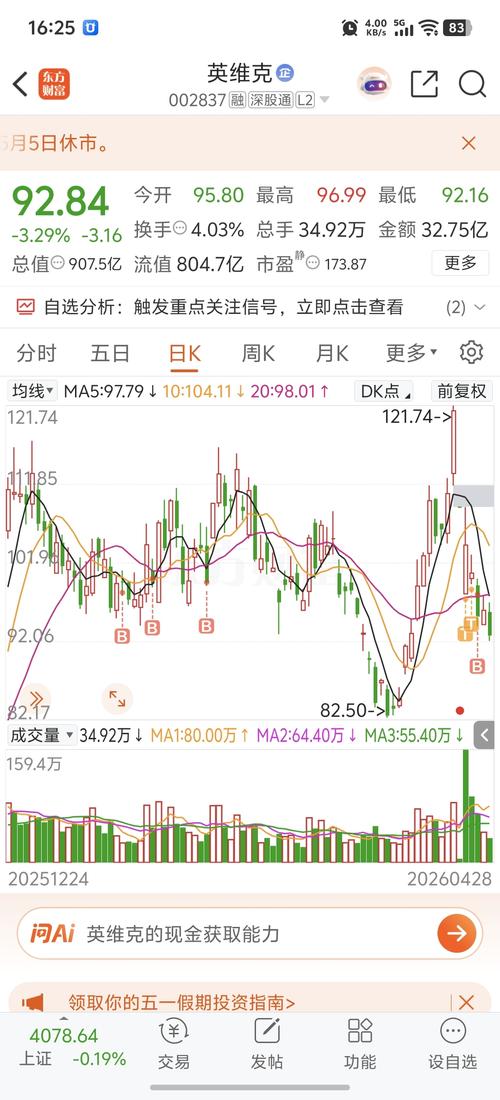 午盘话英维克:盘中展望 盘中股价95.17元,涨幅2.51%,委比-67.92%,买一挂单47手,温控设备板块分化下买盘承接力度偏弱;成交量15.99万手,换手率1.84%,资金交投一般,筹码锁定性尚可;量比0.67,交易活跃度不高,上午整体走势震荡偏强。当下盘面节奏清晰,短线波动空间有限,资金关注度尚可,当下保持正常看待即可。小幅留意午后承接强弱即可,无需过度操作,当前无异常风险信号,按既定持仓...