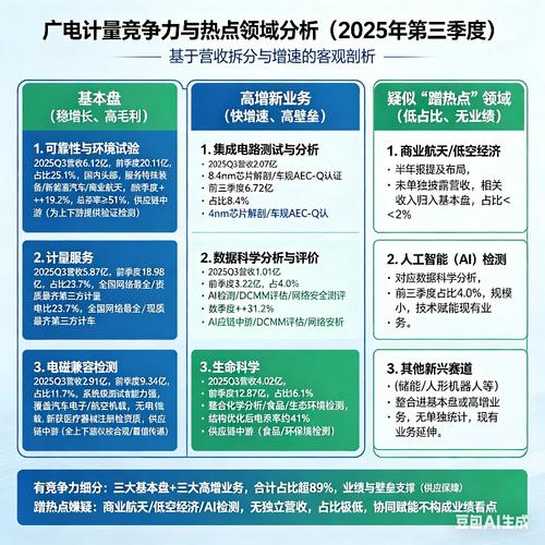 $广电计量(SZ002967)$ 广电计量2025年Q3业绩与供应链定位核心结论 一、2025年Q3业绩核心延伸(营收维度) 1.基本盘营收稳增,筑牢业绩底座:2025年前三季度,可靠性与环境试验、计量服务两大核心业务合计营收占比超47%,延续2024年增长趋势。其中可靠性与环境试验前三季度营收同比增长18.2%,计量服务同比增长15.7%;Q3单季两大业务营收增速均超全年均值,新能源汽车、航空航...