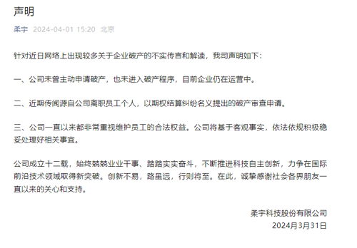 针对近日网络上出现较多关于企业破产的不实传言和解读,柔宇科技股份有限公司发布声明称,公司未曾主动申请破产,也未进入破产程序,目前企业仍在运营中。近期传闻源自公司离职员工个人,以期权结算纠纷名义提出的破产审查申请。公司一直以来都非常重视维护员工的合法权益。公司将基于客观事实,依法依规积极稳妥处理好相关事宜。