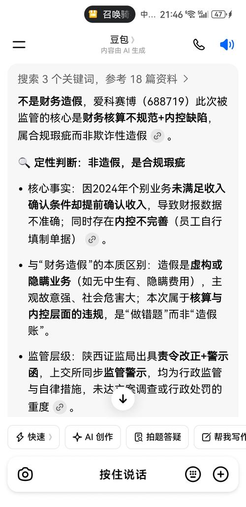 $爱科赛博(SH688719)$西安爱科赛博电气股份有限公司(证券代码:688719,简称:爱科赛博)因财务核算不规范、内部控制不完善,导致财务数据披露不准确,收到中国证监会陕西监管局的行政监管措施决定书及上海证券交易所的监管警示。 核心违规事实:经陕西证监局查明,爱科赛博存在以下问题:财务核算不规范:公司2024年个别业务在未满足收入确认政策情况下提前确认收入,不符合《企业会计准则》规定。该事项...