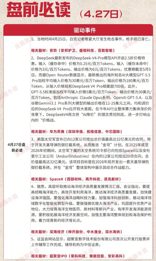 4月27日早间汇总 1、国务院总理李强4月24日主持召开国务院常务会议,研究科技创新有关工作,听取推动海洋经济高质量发展情况汇报,审议通过《行政法规制定程序条例(修订草案)》。 2、中办、国办近日发布《关于加强新就业群体服务管理的意见》。其中提出,加强互联网平台算法治理;督促互联网平台企业、快递企业等根据工作任务、劳动强度等合理确定新就业群体劳动报酬,及时足额支付。 3、上交所近日修订发布《上海证...