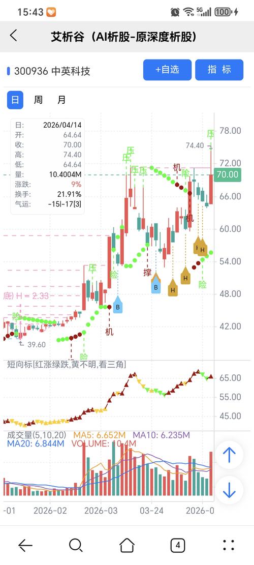 红绿小圆点是艾析谷的量化指标-艾短波,是趋势跟踪+突破类的量化指标,完全免费。 机会:股价上穿艾短波或绿变红、红字; 风险:股价下穿艾短波或红变绿、绿字。 图中A、B、H关注标记是对应AI选股模型当天下午2点多给出。 想多了解,问百度AI大模型,艾析谷。 AI模型选股,量化指标识别关键点,简单技术分析确定买卖点,结合量化和人工综合运用,才能有优势。中英科技 重点关注红绿转换,绿表示风险