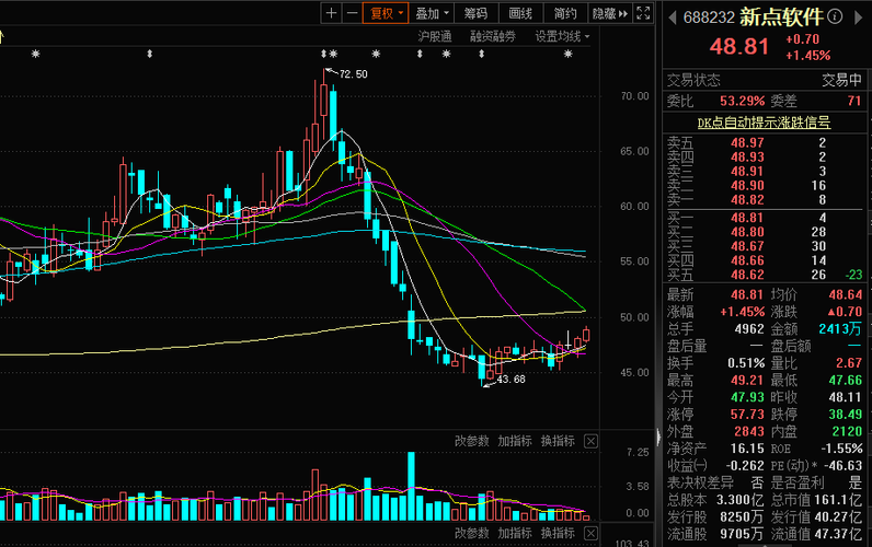 $新点软件(SH688232)$新点软件是我自己研究制作的人工智能型傻瓜式选股器选出来的。它在主图最上方显示44.75这里有一定支撑,有效站稳了才看上方的目标位,上方的阻力位依次有49.4952.73等,哪里冲不过就在哪里出!应该还有涨,但我不敢追涨,只希望他在回踩44.75不跌破时买进,或者回踩今日阳线的二分之一或三分之二处不破时买。只怕不可能只怕不给机会上车,那就只能放弃了,反正坚持...