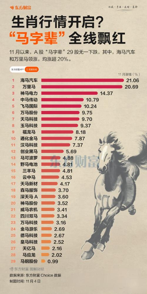 临近年底,“玄学炒股”的浪潮再起。生肖行情炒作下,A股市场仿佛提前进入“贺岁档”。 11月4日,A股三大指数调整,“马字辈”股票却逆势大涨!