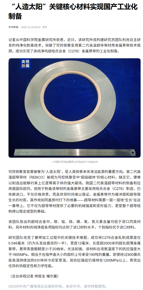 央视新闻:“人造太阳”关键核心材料实现国产工业化制备