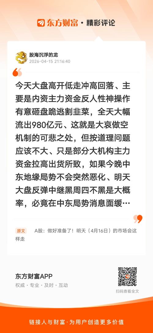 今天大盘高开低走冲高回落、主要是内资主力资金反人性神操作有意砸盘跪逃割韭菜,全天大幅流出980亿元、这就是大哀做空机制的可悲之处,但按道理问题应该不大、只是部分大机构主力资金拉高出货所致,如果今晚中东地缘局势不会突然恶化、明天大盘反弹中继黑周四不黑是大概率,必竟在中东局势消息面缓和、外围股市都是连续大涨的情况下,明天大盘最少也会先抑后扬收小阳吧、关键看今晚美股的走势不大跌就没问题,谢谢老师分析分享...