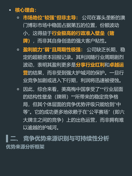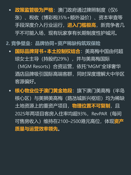 $美高梅中国(HK|02282)$$金沙中国有限公司(HK|01928)$$银河娱乐(HK|00027)$别以为拿到澳门赌牌就等于抱上了躺赢的金饭碗,美高梅中国的“护城河”其实成色并不高。 它目前所有竞争优势的根基,都是澳门业的行政准入壁垒。全澳门一共只发6张赌牌,有效期到2032年,新玩家根本没法进场抢蛋糕,只要行业正常运转,它的经调整EBITDA利润率就能稳定在25%到30%的行业优秀水平...