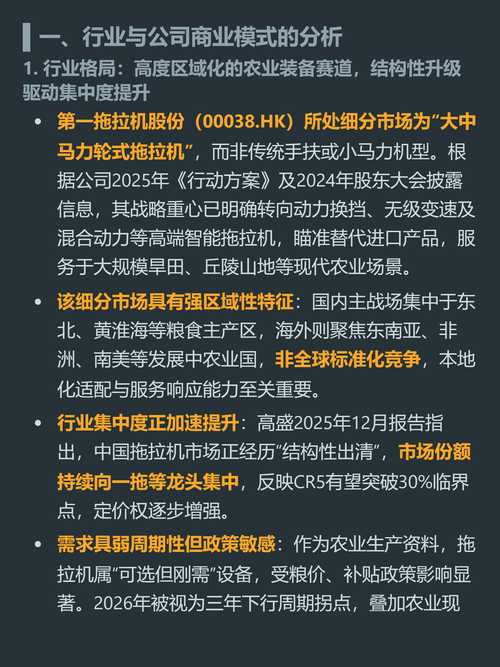 $第一拖拉机股份(HK|00038)$$中国一重(SH601106)$$中联重科(SZ000157)$你可能没想到,造拖拉机的公司,现在已经能正面刚约翰迪尔这种海外农机巨头了。 第一拖拉机的核心赛道是大中马力智能拖拉机,不是大家印象里的小手扶,现在战略重心全放在动力换挡、无级变速、混合动力的高端机型上,目标就是替代进口。 这个赛道根本不是全球标准化竞争,拼的就是本地化适配和服务响应速度。现在国内刚...