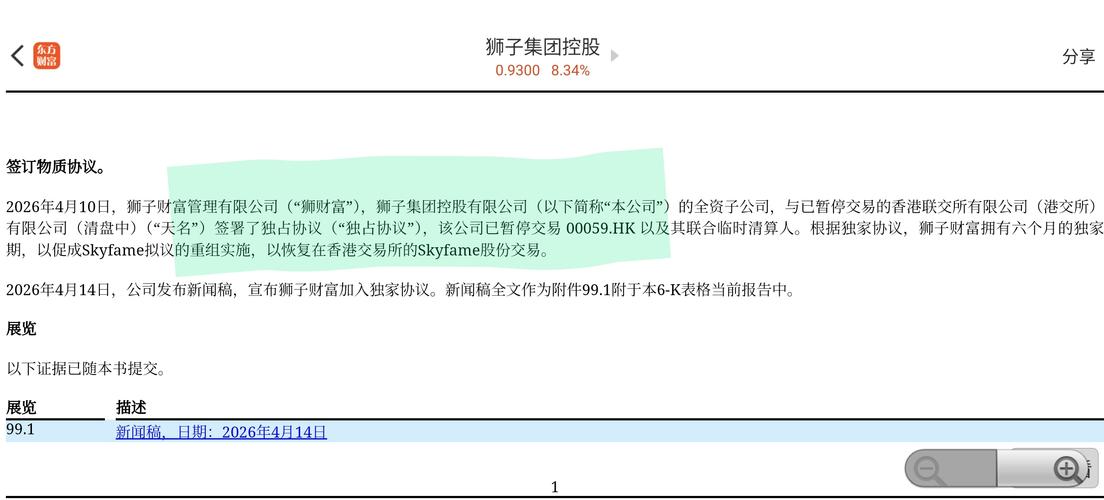 格隆汇4月13日丨天誉置业(00059.HK)公告,于2026年4月10日,(i)公司;(ii)LionWealthManagementLimited("投资者");及(iii)EYBermudaLimitedMichaelPenrose、安永企业财务服务有限公司苏洁仪及刘韵文,以及EYCaymanLtdJoelEdwards,已订立一份独家协议。 公司已自签订独家协议日起,向投资者授出为期6个月...