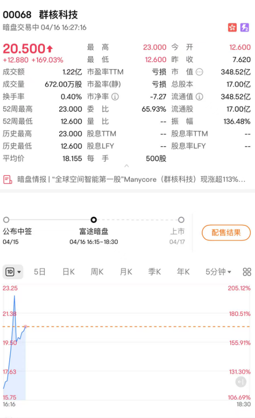 4月16日暗盘一开,“全球空间智能第一股”Manycore($MANYCORETECH(HK|00068)$)暗盘涨幅一度扩大至200%!股价最高触及23港元,一手最高赚逾7500港元。 作为"杭州六小龙"中首个上岸的独角兽,群核带来是一个被低估的终极赛道:空间智能(SpatialIntelligence)。 在此之前,港股AI板块的叙事主线一直围绕大语言模型与算力芯片展开:智谱、MiniMax定...
