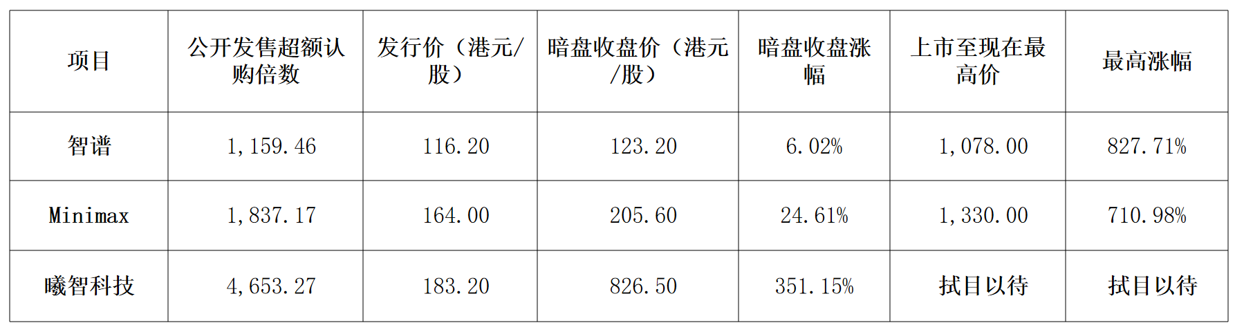 $曦智科技-P(HK|01879)$上市前的暗盘收盘价大涨351.15%,报收826.50港元/股。大大超过了同属AI超级大赛道的$智谱(HK|02513)$和$MINIMAX-W(HK|00100)$。 这一增幅从其“公开发售超额认购倍数”中便可见端倪。曦智科技公开发售超额认购倍数高达4,653倍,远超智谱的1,159倍和Mimimax的1,837倍(不同券商统计的数据,可能略有差异)。 这一奇...