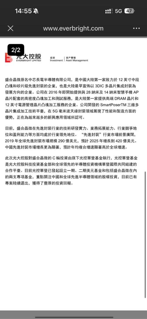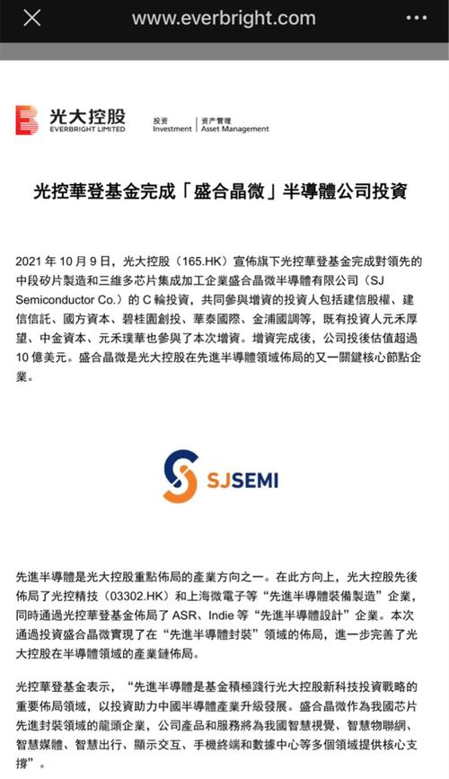 $盛合晶微(SH688820)$$中国光大控股(HK|00165)$ 2021年10月9日,光大控股(00165.HK)宣佈旗下光控华金完成对领先的盛合晶微半导体投资,占股~2%