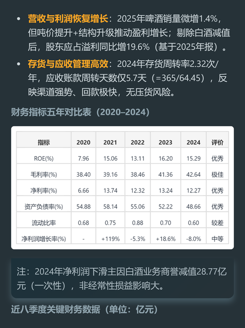 $华润啤酒(HK|00291)$$金种子酒(SH600199)$ 2025年的财报季,对于华润啤酒而言,是一个微妙且充满张力的时刻。 摆在投资者面前的,是一份非常光鲜的成绩单。 财报显示,公司综合营业额为379.85亿元,虽微降1.68%,但扣除特别事项后,未计利息、税项、折旧及摊销前盈利(EBITDA)达到98.79亿元,同比增长9.9%;股东应占溢利更是录得57.24亿元,同比劲...