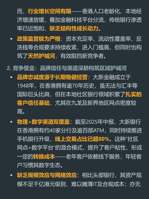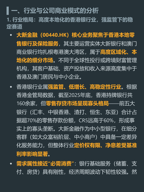 $大新金融(HK|00440)$$友邦保险(HK|01299)$$中国平安(SH601318)$你以为扎根香港70年的本地银行是躺赚的现金牛?大新金融可能要打破这个刻板印象。 它是典型的港澳区域中小银行,核心收入就是本地居民和中小商户的存贷息差,净利息收入占总营收的70%到75%。香港零售存贷市场本来就是寡头格局,前五大行占了70%以上的存款份额,它作为中小玩家根本没有定价权,净息差常年只有1.3...