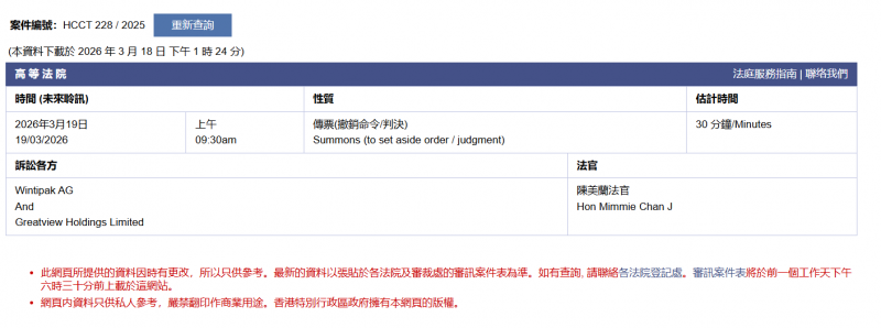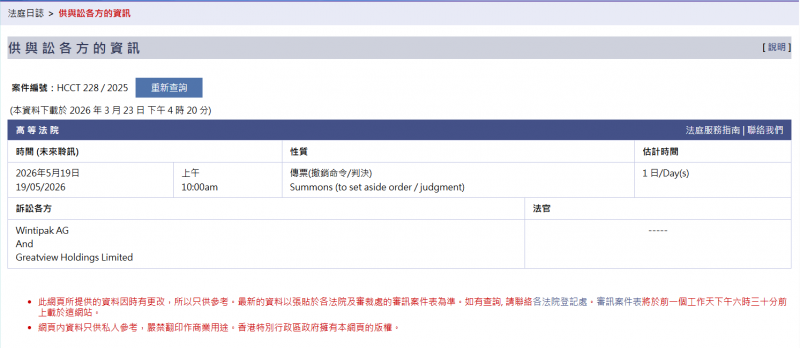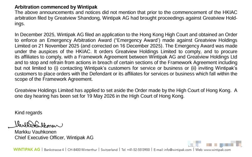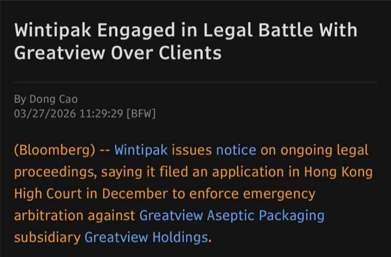 $新巨丰(SZ301296)$$纷美包装(HK|00468)$ WintipakEngagedinLegalBattleWithGreatviewOverClients 作者:DongCao,2026年3月27日11:29:29[BFW] (Bloomberg)--Wintipakissuesnoticeonongoinglegalproceedings,sayingitfiledanapplic...
