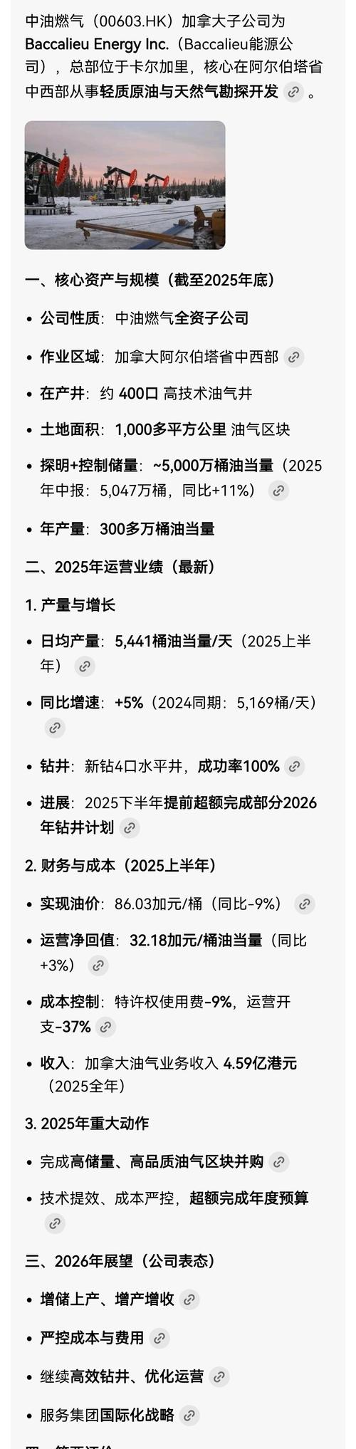 $中油燃气(HK|00603)$集团积极推进国际化能源发展战略,全资子公司加拿大BACCALIEU能源公司年生产石油天然气300多万桶,现拥有近400多口高技术油气在产井、油气土地面积1000多平方公里,目前探明加控制储量近5000万桶当量优质油气资源。