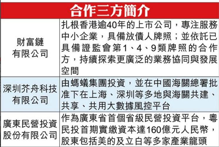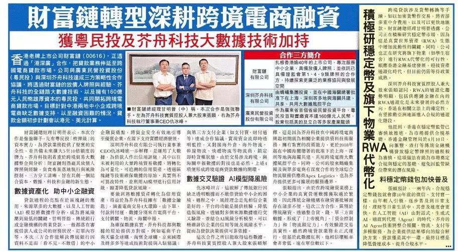 格隆汇4月20日丨财富链(00616.HK)宣布,公司与深圳芥舟科技有限公司("芥舟")及GortuneInternationalInvestmentHoldingLimited(“粤民投”)订立合作备忘录,据此合作备忘录的订约方同意建立战略合作关系,并凭藉集团的相关专业经验,以及芥舟在跨境供应链领域的技术研发、系统建设、数据处理及人工智能("AI")风险控制建模能力,共同探索与集团贷款融资业务有...