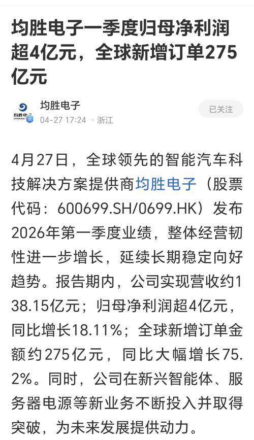 资讯 均胜电子:2026年一季度归母净利润同比增长超18%,新获全球订单超270亿元