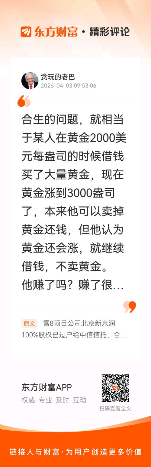 //@贪玩的老巴:合生的问题,就相当于某人在黄金2000美元每盎司的时候借钱买了大量黄金,现在黄金涨到3000盎司了,本来...9赞 -