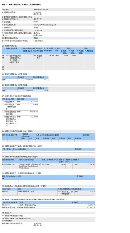 $网龙(HK|00777)$4月14日报道,根据香港联交所4月14日披露的文件,刘德建于4月13日以每股均价8.9916港元增持$网龙(00777.HK)$70万股普通股股份,价值约629.41万港元。增持后,刘德建最新持股数目为2.23亿股股份,好仓比例由41.77%升至41.90%。