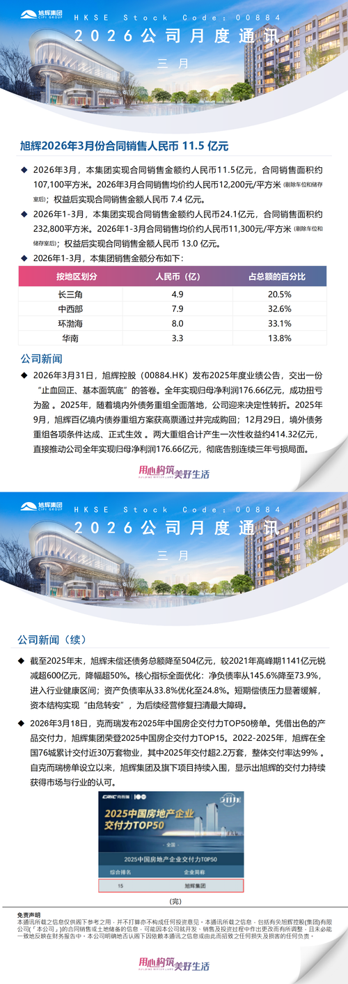 资讯 旭辉控股集团:3月股东权益合同销售额约7.4亿元