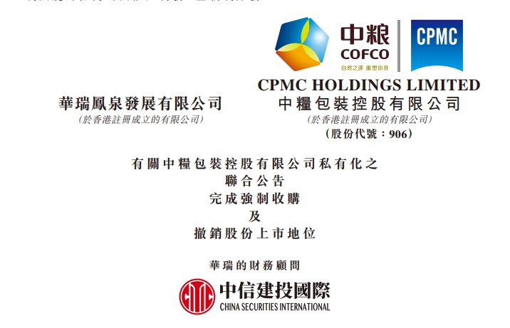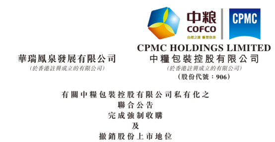 公告 有关中粮包装控股有限公司私有化之联合公告 - 完成强制收购及撤销股份上市地位