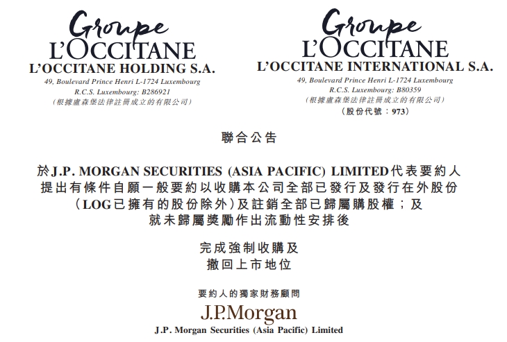 资讯 L'OCCITANE完成强制收购并撤回上市地位