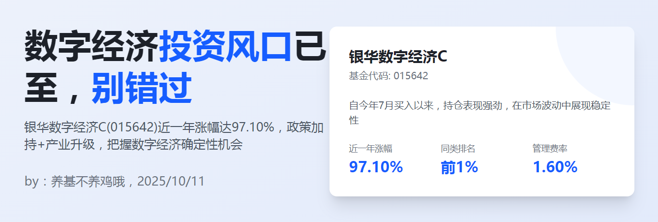 #10月你看好哪些投资赛道?#回答下投教问题:定投是否可以分散投资风险?选A可以。十一小长假结束了,不知道大家在假期里有没有玩的尽兴呢?不过大A可不管你收没收心,节后直接给人来了一记响亮的耳光,3900点得而复失,创业板跌幅达4.55%,说实话,估计不少人都慌了,但我一点没焦虑,反而在琢磨要不要再加点仓——因为从今年7月买了$银华数字经济股票发起式C$到现在,持仓收益率已经达到了21.10%了,...