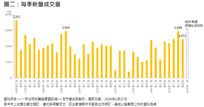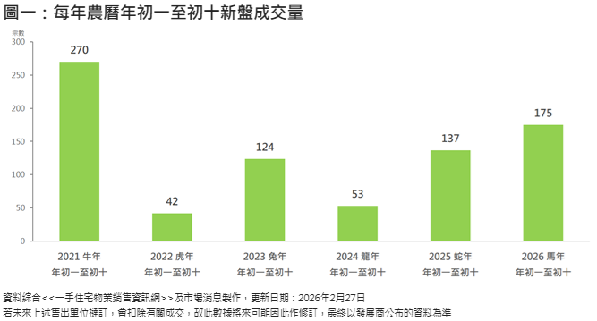 美联集团行政总裁(住宅)马泰阳指出,马年开好局,新春伊始一手成交量表现走好。美联集团行政总裁(住宅)马泰阳指出,马年开好局,新春伊始一手成交量表现走好。据美联物业研究中心综合《一手住宅物业销售信息网》资料及市场消息,马年大年初一至大年初十新盘成交量录约175宗,较去年蛇年同期的137宗同比大升约27.7%,并创自2021牛年后的5年同期新高。 马泰阳续称,2026年楼市一马当先开好局,楼价升势持续...