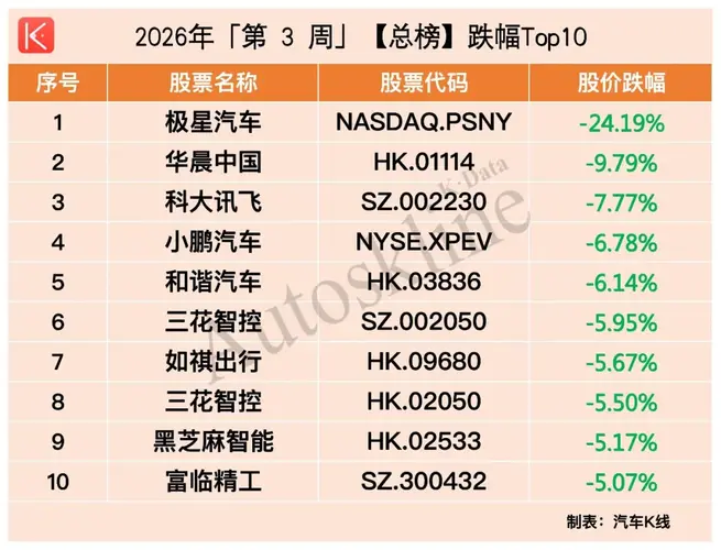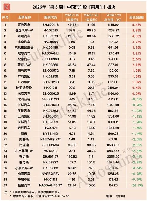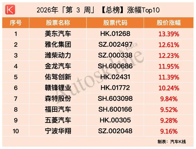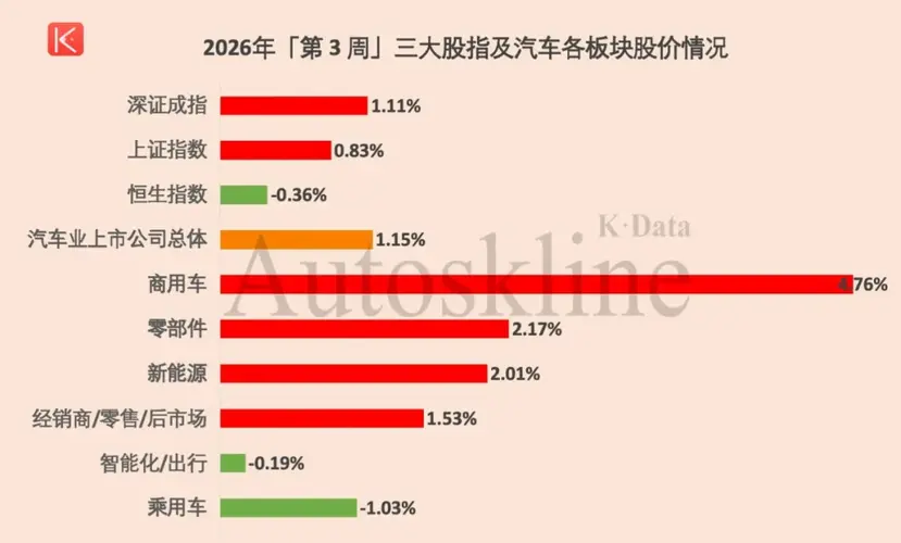 资金正从宏大叙事,流向价值洼地。 2026年第3周,中国汽车业上市公司的股价表现,将“结构性行情”演绎到了新高度。 本期榜单,将进入汽车行业分蛋糕的美团和京东美股、港股纳入经销商/零售/后市场板块,《汽车K线》统计在册的汽车股增加至134只,股价平均上涨1.15%,整体涨多跌少,总市值约14.22万亿元。 其中,商用车板块以4.76%的平均涨幅“一骑绝尘”,成为各板块中最亮眼的风景;而乘用车板块依...
