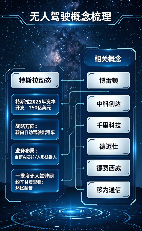 特斯拉大幅上调资本开支预期,将2026年资本支出上调至250亿美元,较2025年90亿美元大幅增长。公司战略重心全面转向自动驾驶出租车、自研AI芯片与人形机器人业务。此外,今年一季度其无人驾驶网约车付费行驶里程环比近乎翻倍,商业化进程持续提速。 目前无人驾驶主要分为两大落地赛道: 城市公开道路Robotaxi(特斯拉),技术难度高; 封闭场景无人商用车(博雷顿),商业化落地更早。 博雷顿聚焦露天矿...