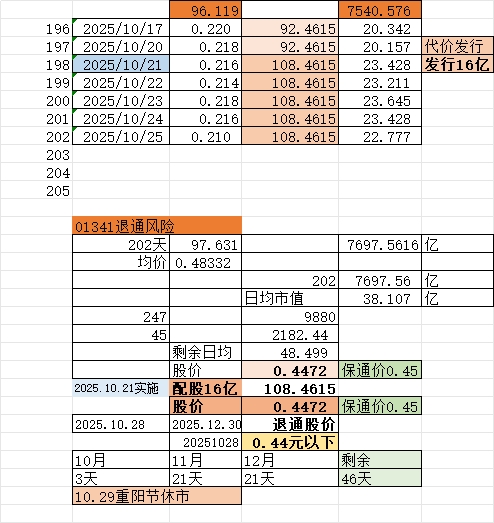 $昊天国际建投(HK|01341)$ 2025——日均市值38.1亿【退通风险】 保通日均市值48.5亿 保通价【0.45元以上】 退通过度期【2026.1——2026.3】 退通估值0.200——0.180元 下跌风险 【-4.76%——-14.3%】风险可控 0.200/0.210-1=-0.0476 0.180/0.210-1=-0.1428 反弹空间10%——20% 0.200*1.30=...