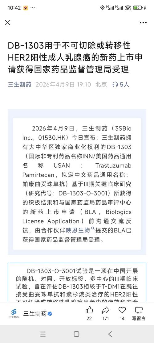 2026年4月9日,三生制药(3SBioInc.,01530.HK)今日宣布:三生制药拥有大中华区独家商业化权利的DB-1303(国际非专利药品名称INN/美国药品通用名称USAN:TrastuzumabPamirtecan,拟定中文药品通用名称:帕康曲妥珠单抗)基于III期关键临床研究(研究代号:DB-1303-O-3001)所获得的积极结果和与国家药监局药品审评中心的新药上市申请(BLA,Bi...