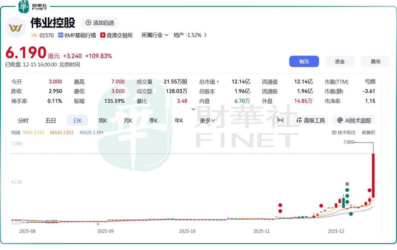 近期,$伟业控股(HK|01570)$股价开启了一波稳健的升势,走势颇为凌厉。 12月15日,该公司股价延续上行节奏,收盘大幅飙升109.83%,报6.19港元/股。11月20日至今,伟业控股累计涨幅已达291.77%。 值得注意的是,亮眼股价表现背后,伟业控股流动性并不好,日常成交量维持在几千到几万股水平,甚至频繁出现单日无成交量情况,这反映出投资者参与热情并不高。 即便在12月15日股价暴涨1...