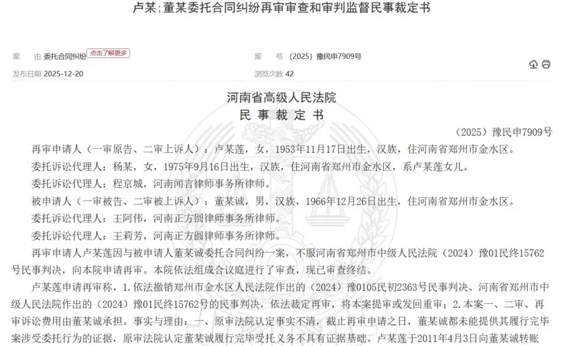 河南上市房企老板被曝离婚。 2025年12月,中国裁判文书网刊登的《卢某;董某委托合同纠纷再审审查和审判监督民事裁定书》【案号:(2025)豫民申7909号】(下称:裁定书)披露,河南上市房企伟业控股(01570.HK)实控人张伟正在办理离婚。 卢某莲,女,1953年11月出生,汉族,住河南省郑州市金水区。 杨某,女,1975年9月出生,汉族,住河南省郑州市金水区,系卢某莲女儿。 董某诚,男,汉族...