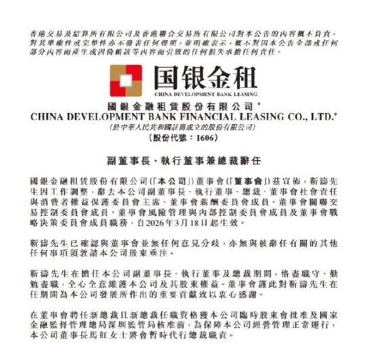 【国银金融租赁:副董事长靳涛因工作调整辞任】3月18日,国银金融租赁股份有限公司发布公告指出,该公司董事会宣布,靳涛因工作调整,辞去该公司副董事长、执行董事、总裁、董事会社会责任与消费者权益保护委员会主席、董事会薪酬委员会成员、董事会关联交易控制委员会成员、董事会风险管理与内部控制委员会成员及董事会战略决策委员会成员职务,自2026年3月18日起生效。 $国银金租(HK|01606)$
