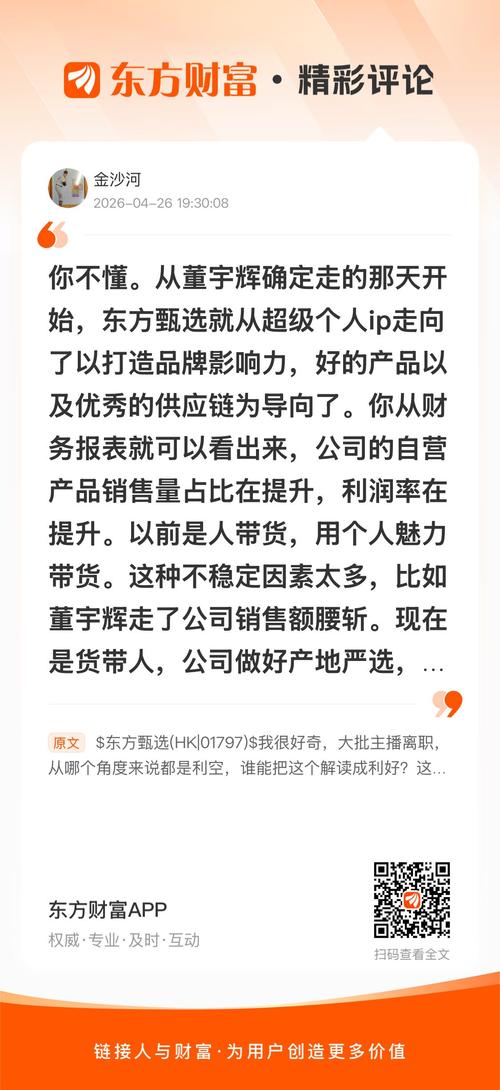 以上,继续看好东方甄选。//@金沙河:回复芜湖起飞哈哈:你不懂。从董宇辉确定走的那天开始,东方甄选就从超级个人ip走向了以打造品牌影响力,好的产品以及优秀的供应链为导向了。你从财务报表就可以看出来,公司的自营产品销售量占比在提升,利润率在提升。以前是人带货,用个人魅力带货。这种不稳定因素太多,比如董宇辉走了公司销售额腰斩。现在是货带人,公司做好产地严选,做好产品品质把控,做好产品讲解的流程拆解优化...