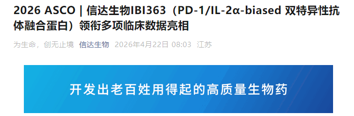 $信达生物(HK|01801)$ 2026ASCO|信达生物IBI363(PD-1/IL-2-biased双特异性抗体融合蛋白)领衔多项临床数据亮相 为生命,创无止境信达生物2026年4月22日08:03江苏23人星标 2026年4月22日,美国旧金山和中国苏州——信达生物制药集团(香港联交所股票代码:01801),一家致力于研发、生产和销售肿瘤、自身免疫、代谢及心血管、眼科等重大疾病领域创新药物...