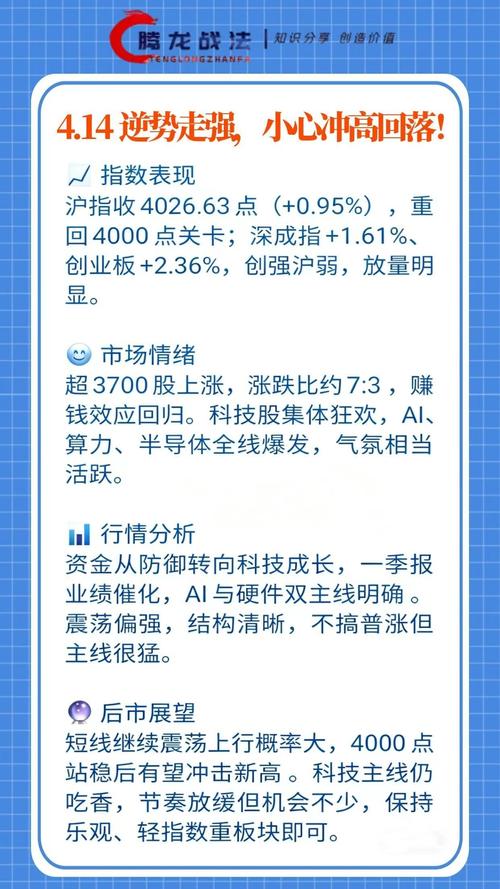 今天中午收盘发了一个帖,莫名其妙,不让你们看,不让看我也就懒得折腾了。哈哈哈 今天行情不错,强推,收4026点,比预期要好点,午后有一波跳水,盘中跳水洗韭菜,洗掉不坚定筹码。 目前继续灵活做多,不要害怕,资金多玩好的科技板块的票就没有问题。
