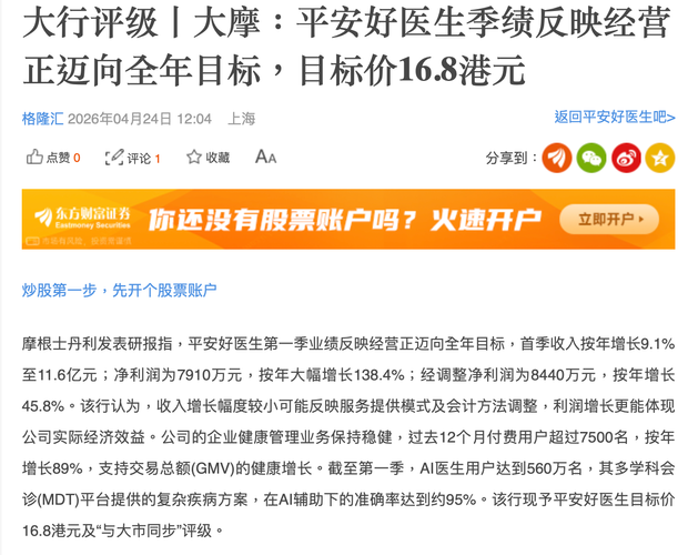大行评级丨大摩:平安好医生季绩反映经营正迈向全年目标,目标价16.8港元