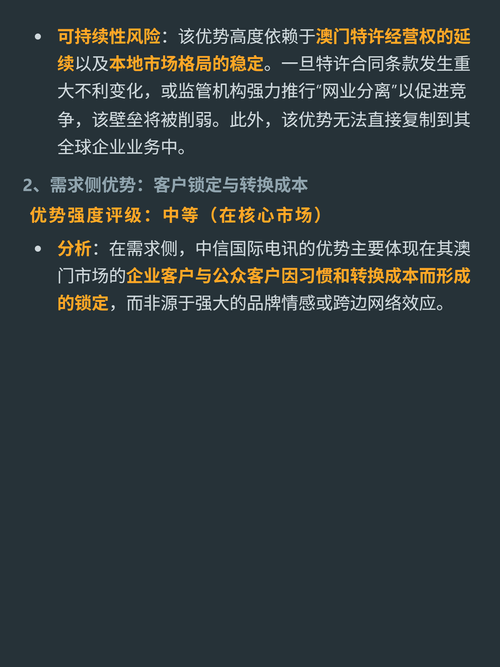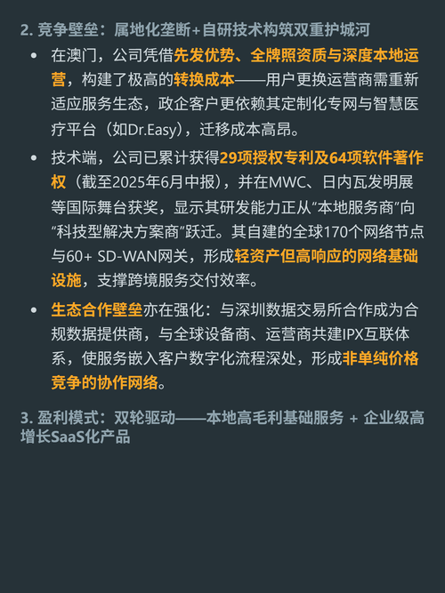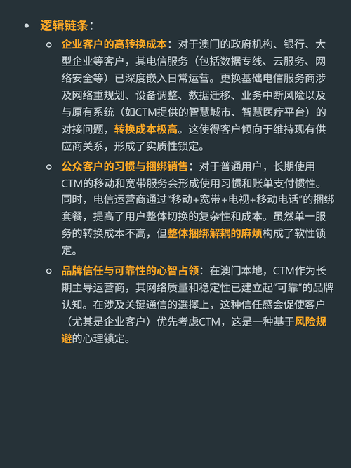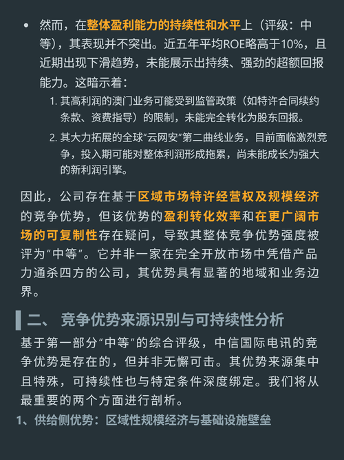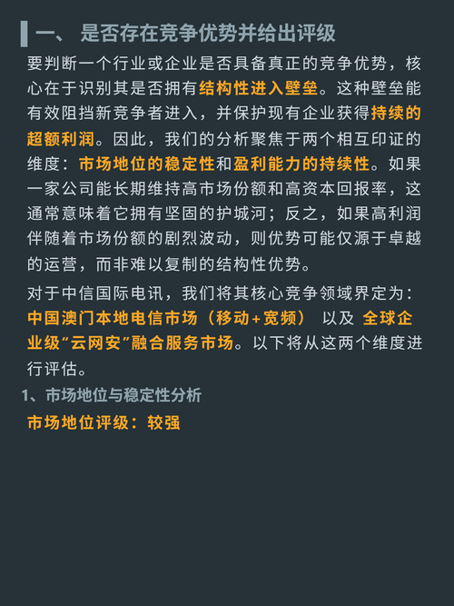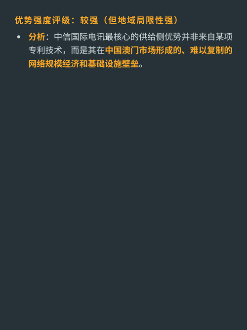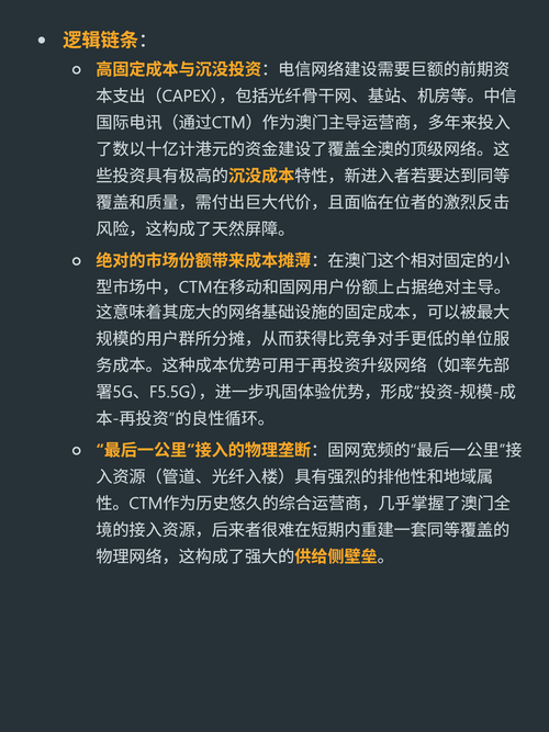 $中信国际电讯(HK|01883)$$中国移动(SH600941)$$中国联通(SH600050)$最近研究中信国际电讯,最大的感受是它有“深厚但狭窄”的护城河——澳门本地电信业务的垄断优势稳固,但全球“云网安”业务还没突围。 核心逻辑:主营中国澳门本地电信(移动+宽频,子公司CTM占绝对主导)、全球企业级“云网安”融合服务。商业模式靠澳门市场的区域垄断(特许经营权+基础设施壁垒)做现金牛,再拓展...