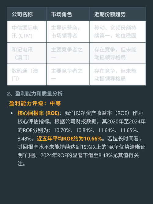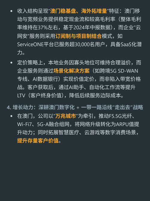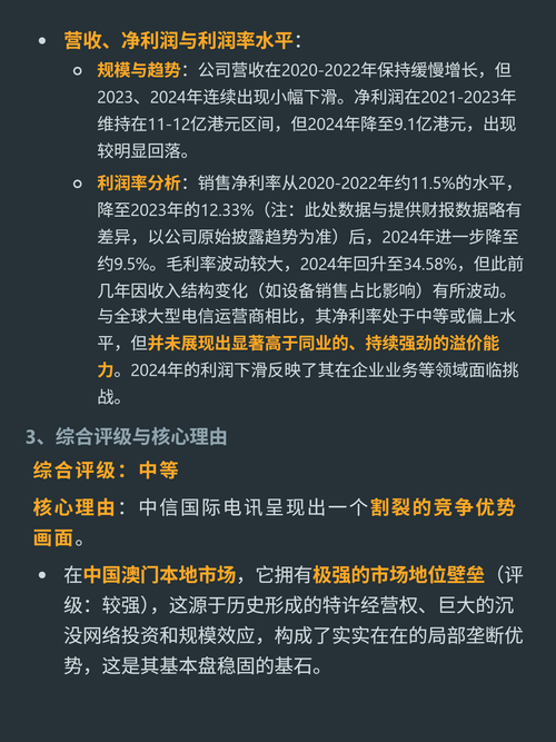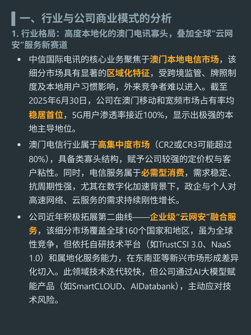 $中信国际电讯(HK|01883)$$中国移动(SH600941)$$中国电信(SH601728)$研究中信国际电讯,核心是澳门本地电信寡头的稳基盘+全球云网安的第二曲线,但财务端需关注盈利下滑与短期流动性压力。 核心逻辑:澳门移动和宽频市场占有率第一,5G渗透率近100%,类寡头结构有定价权;第二曲线是全球企业级云网安服务,覆盖160个国家和地区,靠自研平台(TrustCSI3.0、NaaS1....