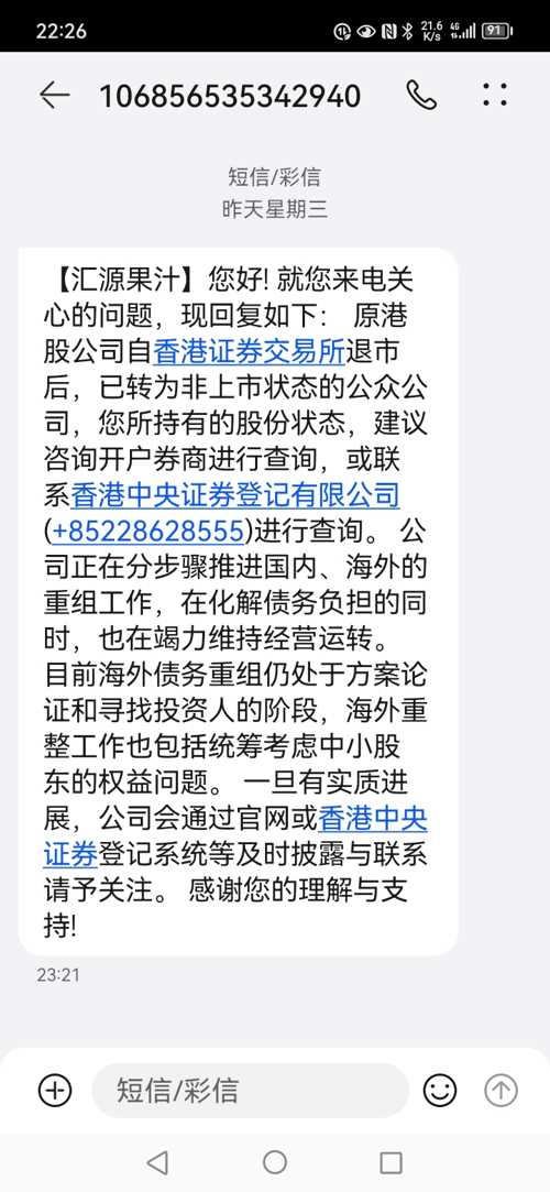 来自退市后汇源果汁对持有股票散户的回应!这个必须点赞!