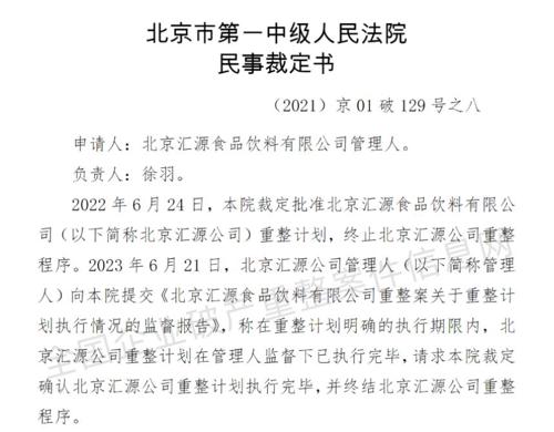 【北京汇源食品饮料有限公司重整计划执行完毕】据全国企业破产重整案件信息网消息,2023年7月5日,北京市第一中级人民法院裁定确认北京汇源食品饮料有限公司重整计划执行完毕;终结北京汇源食品饮料有限公司重整程序。(全国企业破产重整案件信息网)