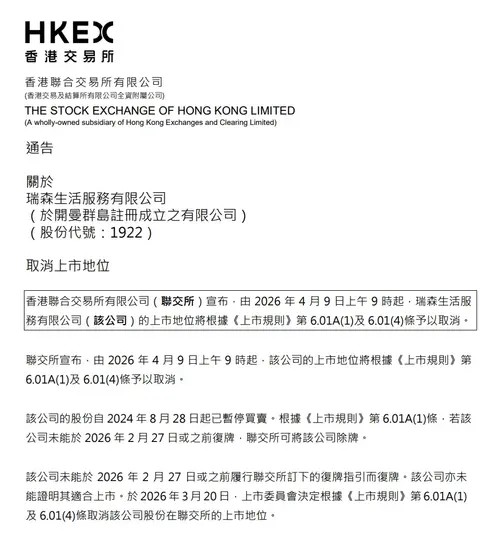 瑞森生活服务(01922)发布公告,香港联合交易所有限公司(联交所)宣布,由2026年4月9日上午9时起,瑞森生活服务有限公司(该公司)的上市地位将根据《上市规则》第6.01A(1)及6.01(4)条予以取消。瑞森生活服务(01922)发布公告,香港联合交易所有限公司(联交所)宣布,由2026年4月9日上午9时起,瑞森生活服务有限公司(该公司)的上市地位将根据《上市规则》第6.01A(1)及6.0...