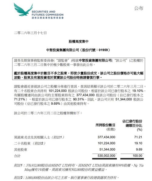 香港证监会最近曾就中聚投资(01959)股权分布进行查讯。香港证监会最近曾就中聚投资(01959)股权分布进行查讯。查讯结果显示该公司于2026年3月2日,有二十名股东合共持有101,224,000股该公司股份,相当于该公司已发行股本之19.10%。有关股权连同由该公司的主要股东持有之377,434,000股该公司股份(占已发行股本之71.21%),相当于该公司已发行股本之90.31%。因此,该公...